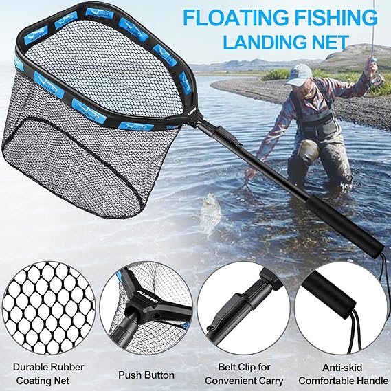 PLUSINNO Floating Fishing Net for Steelhead, Salmon, Fly, Kayak, Catfish, Bass, Trout Fishing, Rubber Coated Foldable Landing Net with Fixed or Telescoping Pole Handle, Fishing Gear and Gifts for Men